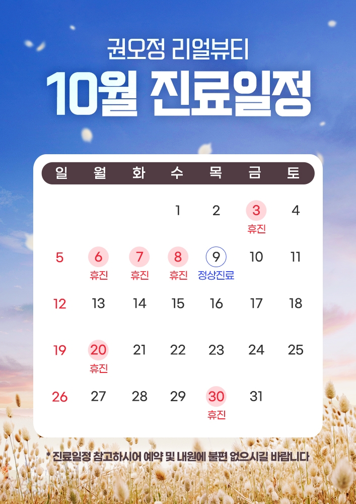 실시간 빠른상담 이름 연락처 010 011 017 018 019 개인정보취급방침 상담신청 [권오정리얼뷰티의원] 10월 진료일정 작성자 : 리얼뷰티 작성일 : 2025-09-30 조회수 : 126 목록