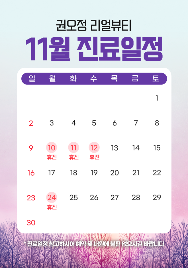 실시간 빠른상담 이름 연락처 010 011 017 018 019 개인정보취급방침 상담신청 [권오정리얼뷰티의원] 11월 진료일정 작성자 : 리얼뷰티 작성일 : 2025-10-30 조회수 : 796 목록