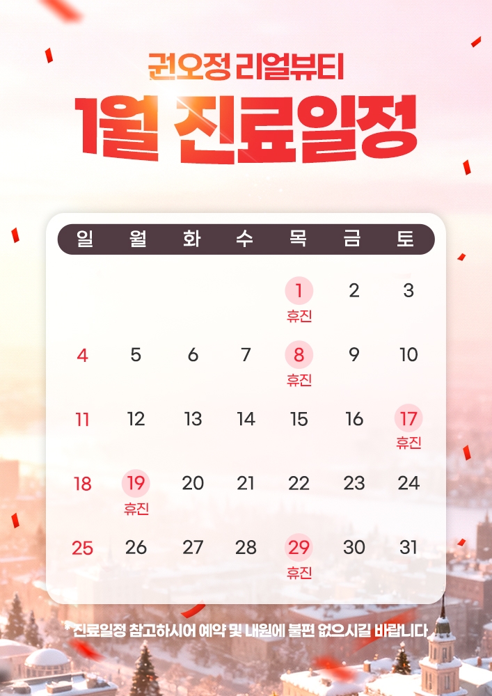 실시간 빠른상담 이름 연락처 010 011 017 018 019 개인정보취급방침 상담신청 [권오정리얼뷰티의원] 1월 진료일정 작성자 : 리얼뷰티 작성일 : 2025-12-30 조회수 : 481 목록